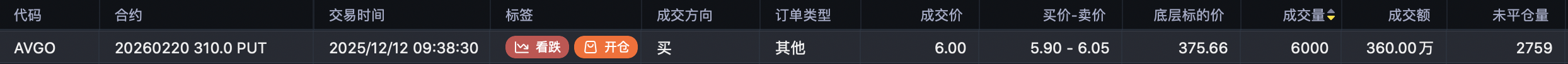 周五开仓看跌大单,目标价310 $AVGO 20260220 310.0 PUT$ ,成交额360万美元。