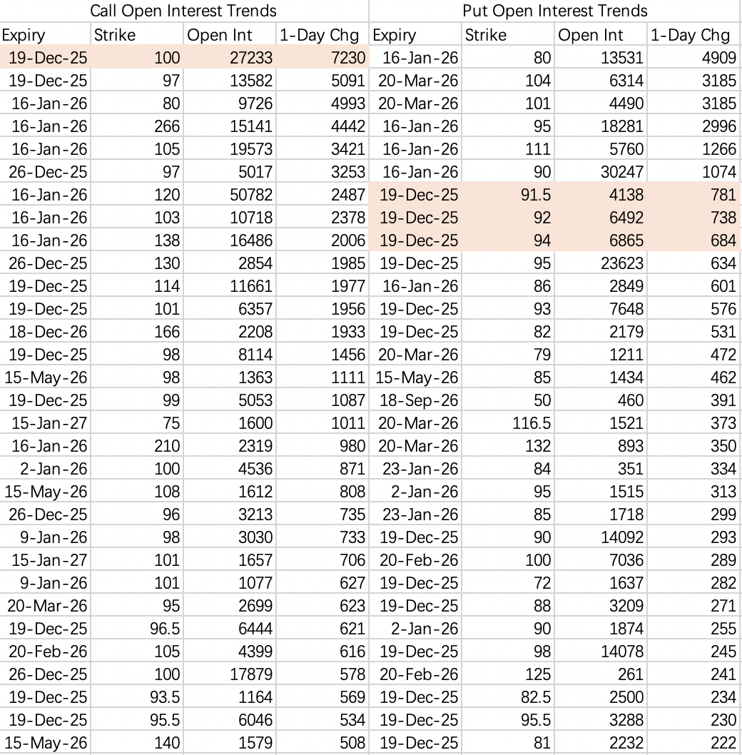 奈飞的期权开仓显示触底迹象,股价大约在90~100区间震荡,趁回调可以考虑sell put$NFLX 20251219 90.0 PUT$