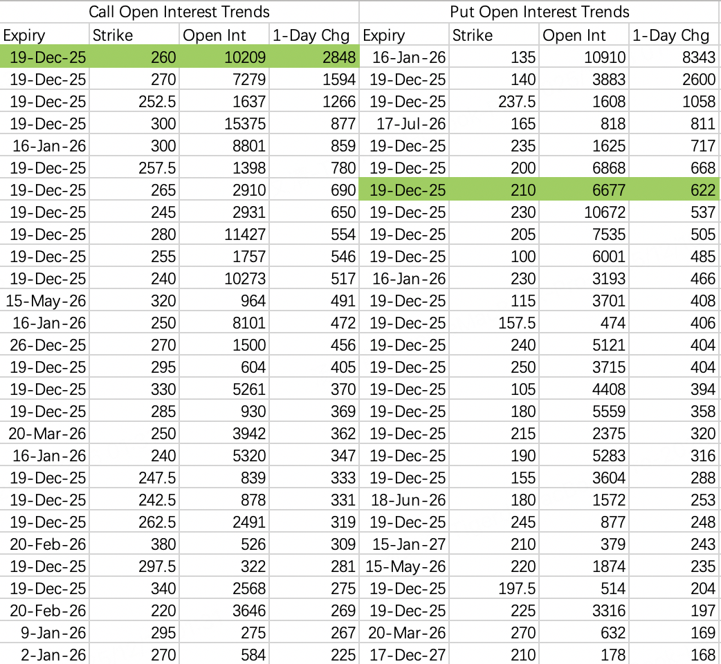 周五有些期权组合认为本周震荡区间会在210~260之间,也比较符合隐含波动区间215~265。我觉得财报可以做宽跨卖出sell call280 $MU 20251219 280.0 CALL$ 和sell put 210 $MU 20251219 210.0 PUT$ ,都需要在财报发布后开盘平仓,毕竟收盘价格就不好说了。