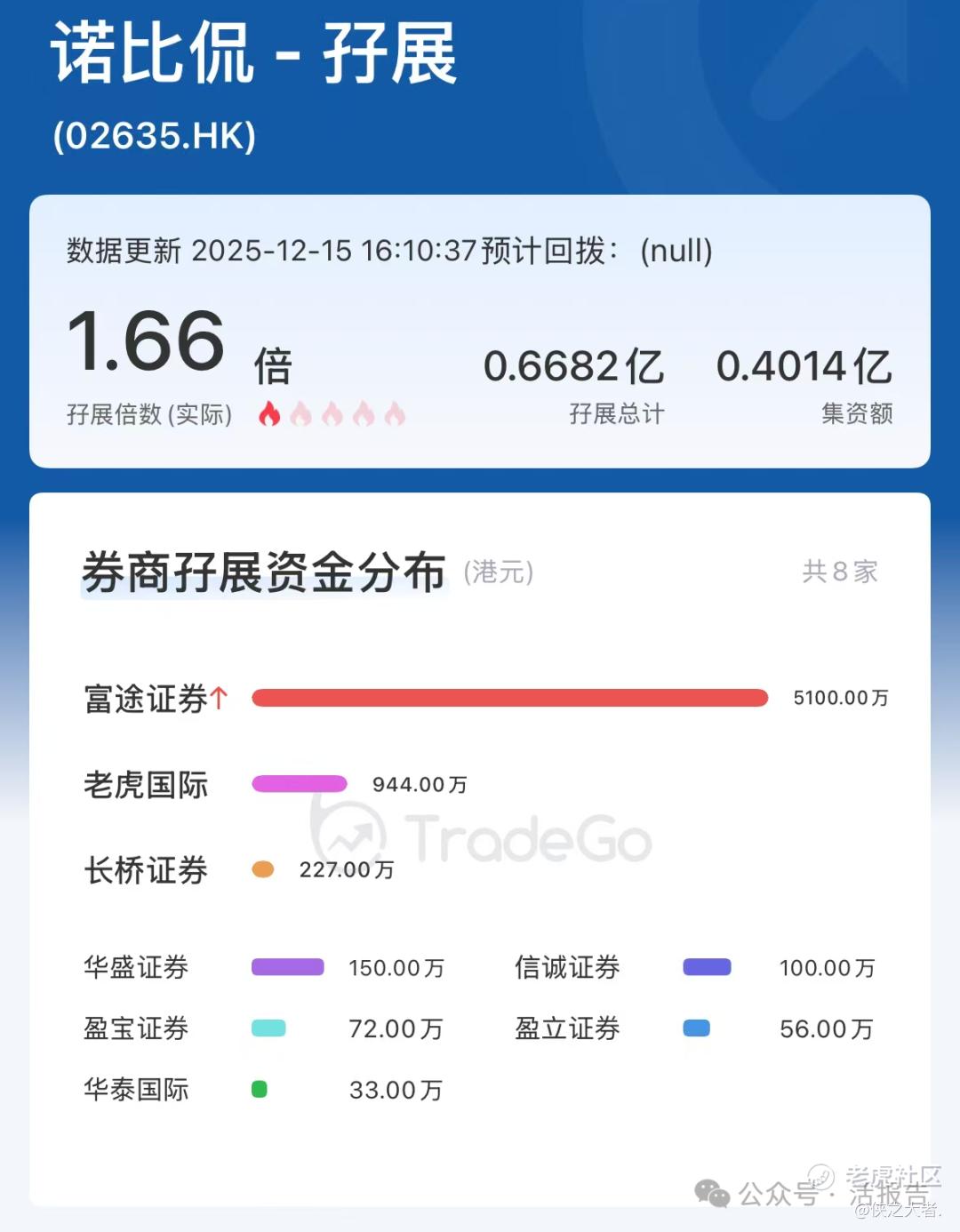 据TradeGo新股孖展数据,截至12月15日16时,诺比侃孖展总额已达6682万港元,孖展认购倍数约1.66倍,首日认购已足额。其中,富途证券、老虎证券、**证券分别放出5100万、944万、227万港元。