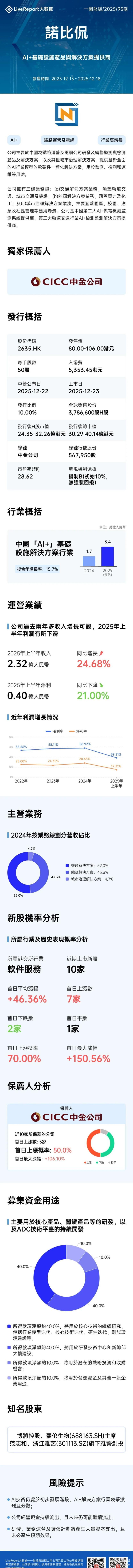 诺比侃(2635.HK)招股日期为2025年12月15日至2025年12月18日,并预计于2025年12月23日在港交所挂牌上市。