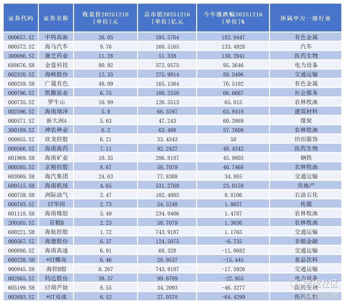 从二级市场表现看,截至12月16日收盘,今年以来,22家公司股价出现上涨。其中, $中钨高新(000657)$ 、海马汽车(000572.SZ)、 $康芝药业(300086)$ 3家公司年内股价已经成功实现翻倍。