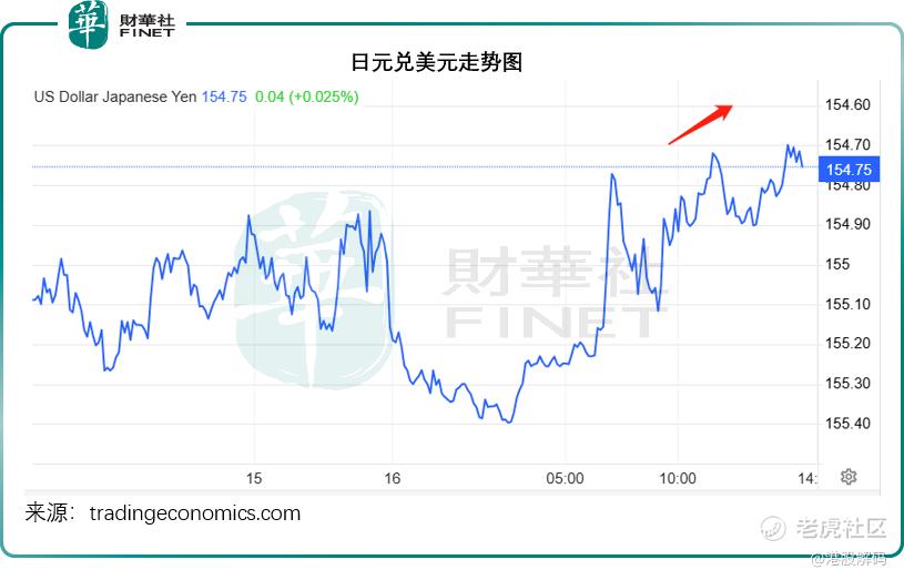其中美元兑日元的跌幅最大,见下图,日元兑美元汇价走强突破155水平,现报154.75。