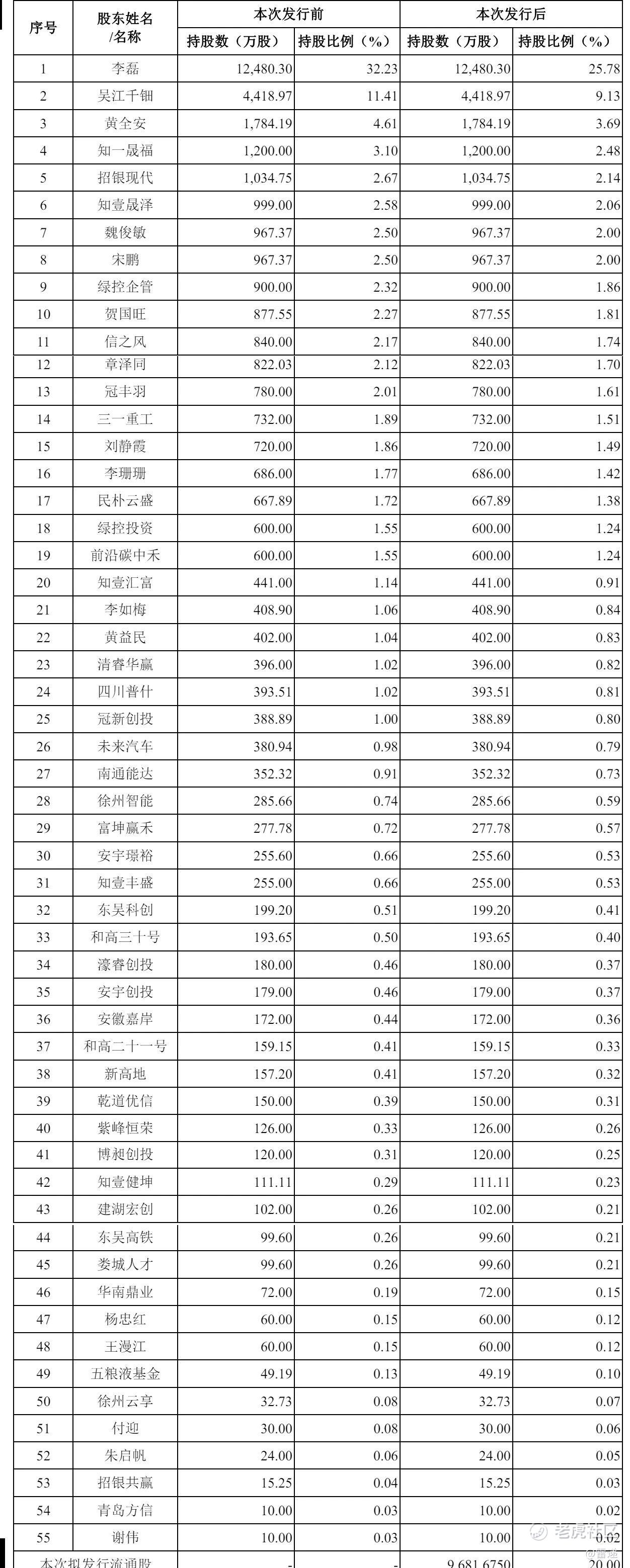 IPO后,李磊持股25.78%,吴江千钿持股为9.13%,黄全安持股为3.69%,知一晟福持股为2.48%,招银现代持股为2.14%,知壹晟泽持股为2.06%,魏俊敏、宋鹏分别持股为2%,绿控企管持股为1.81%,信之风持股为1.74%,章泽同持股为1.7%,冠丰羽持股为1.61%,三一重工持股为1.51%,刘静霞持股为1.49%;