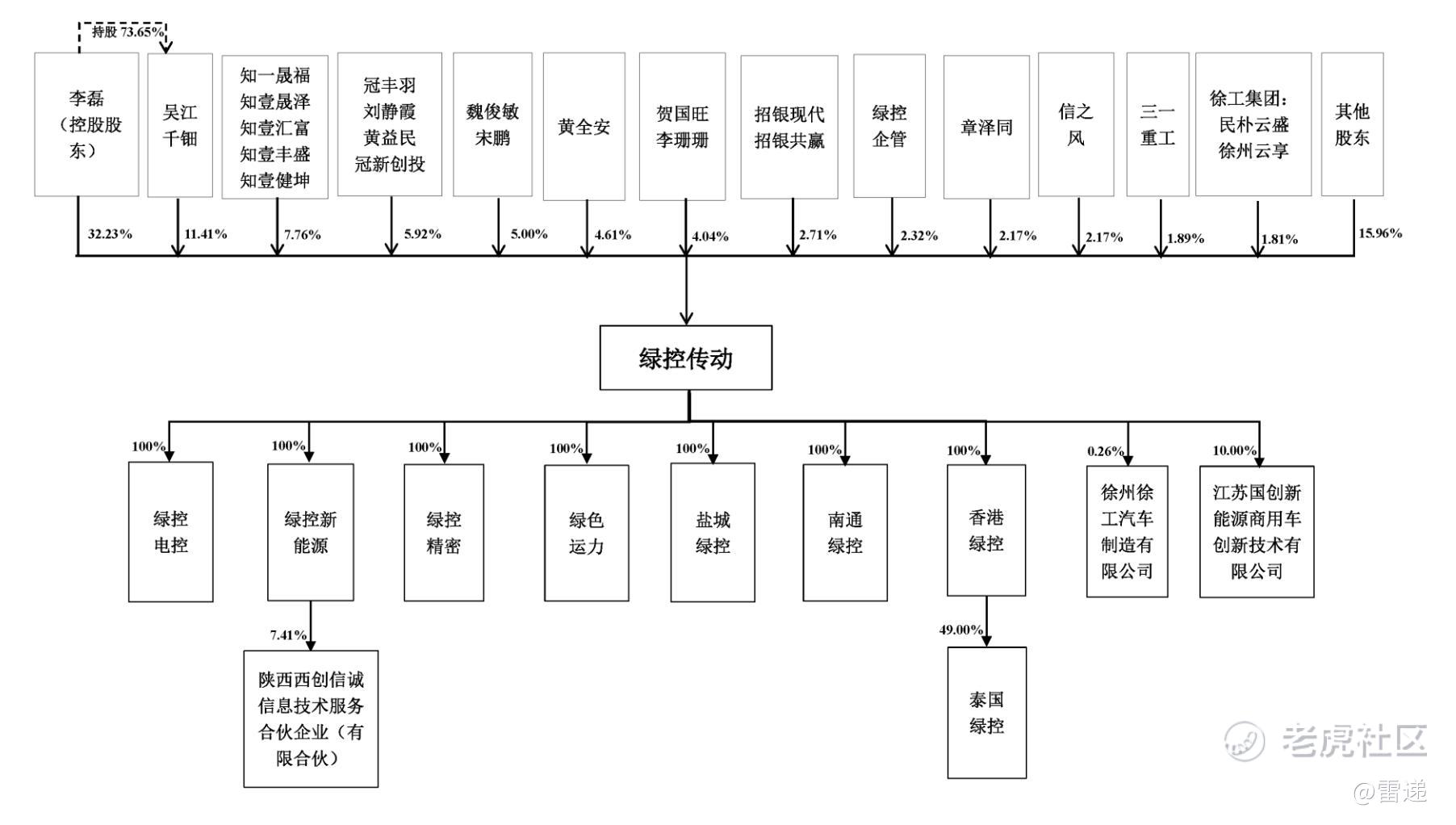 绿控传动的控股股东及实际控制人为李磊。李磊为公司董事长、总经理。李磊直接持有公司12,480.30 万股股份,占公司发行前总股本的 32.23%;李磊作为吴江千钿的控股股东间接控制公司 4,418.97 万股股份,占公司发行前总股本的 11.41%;李磊直接及间接合计控制公司 16,899.27 万股股份,占公司发行前总股本的 43.64%。