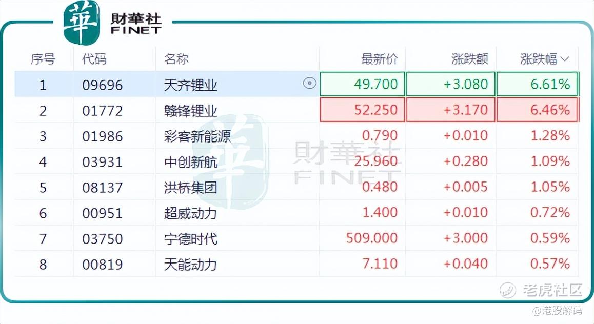 港股方面,锂矿双雄涨势最猛,截至发稿前, $天齐锂业(09696)$ 大涨6.61%, $赣锋锂业(01772)$ 涨6.46%, $中创新航(03931)$ 涨1.09%,宁德时代(03750.HK)、天能动力(00819.HK)等均涨。
