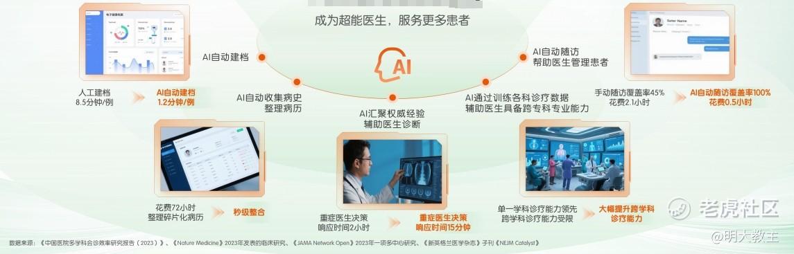 AI可辅助医生建档、整理病例、患者管理、随访等多环节节约时间。如 $平安好医生(01833)$ 今年初推出的AI服务“平安芯医”已覆盖20余个真实医疗场景。“平安芯医”让患者等待时间由4.5天降低至即时,会诊中等待时间由9.7天变为“一键直通”,普通患者无需托关系、无需转诊就能获得不同医院、不同科室名医在线会诊。
