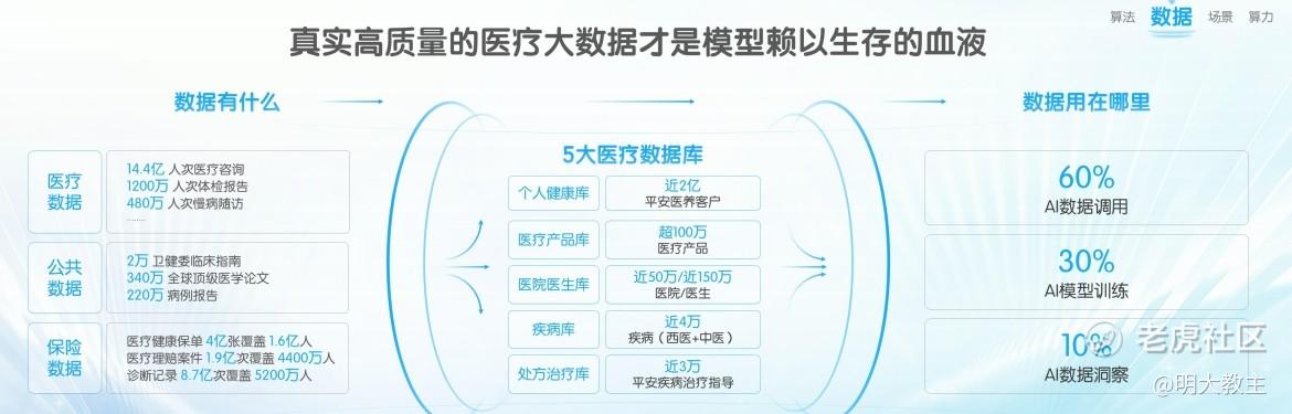 至今年6月末,中国平安除2万+临床指南、340万全球顶级学术论文、220万份病例报告外,还积累了超过14.4亿份咨询记录,1200万人次体检报告,480万人次慢病随访信息,并整合形成“个人健康库”、“医疗产品库”、“医院医生库”、“疾病库”、“处方治疗库”等5大数据库。