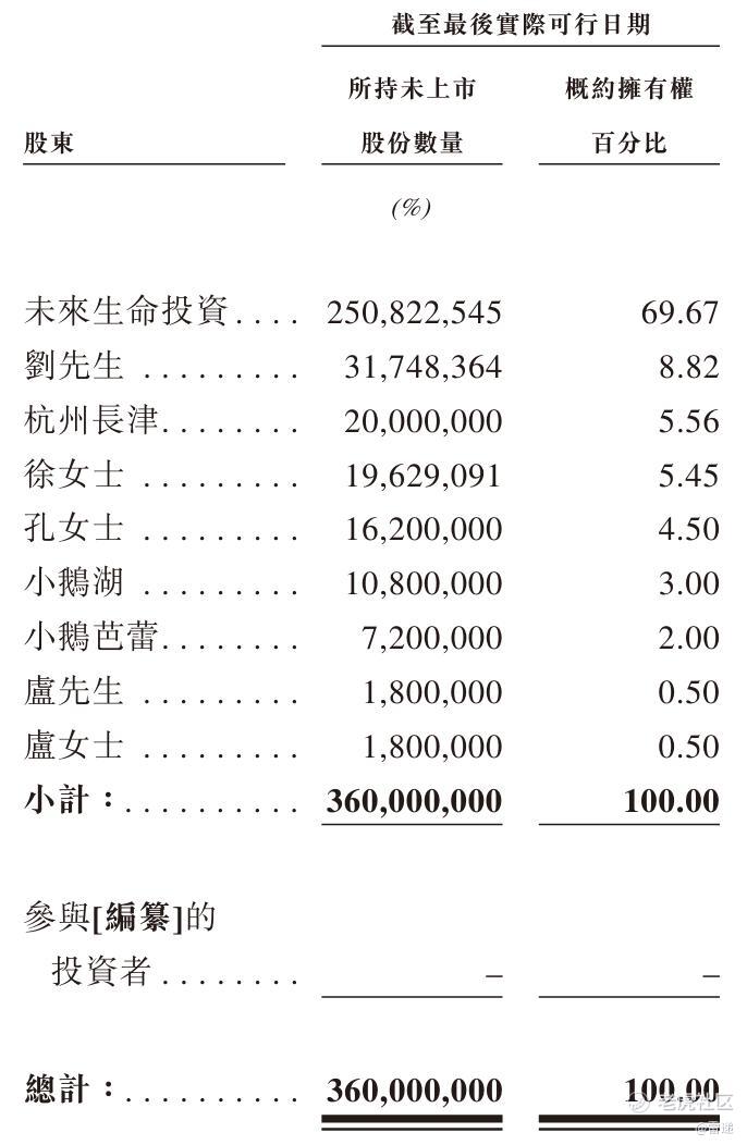 IPO前,未来生命投资持股为69.67%,刘杰持股为8.82%,杭州长津持股为5.56%,徐思英女士持股为5.45%,孔女士持股为4.5%,小鹅湖持股为3%,小鹅芭蕾持股2%,卢先生、卢女士分别持股为0.5%。