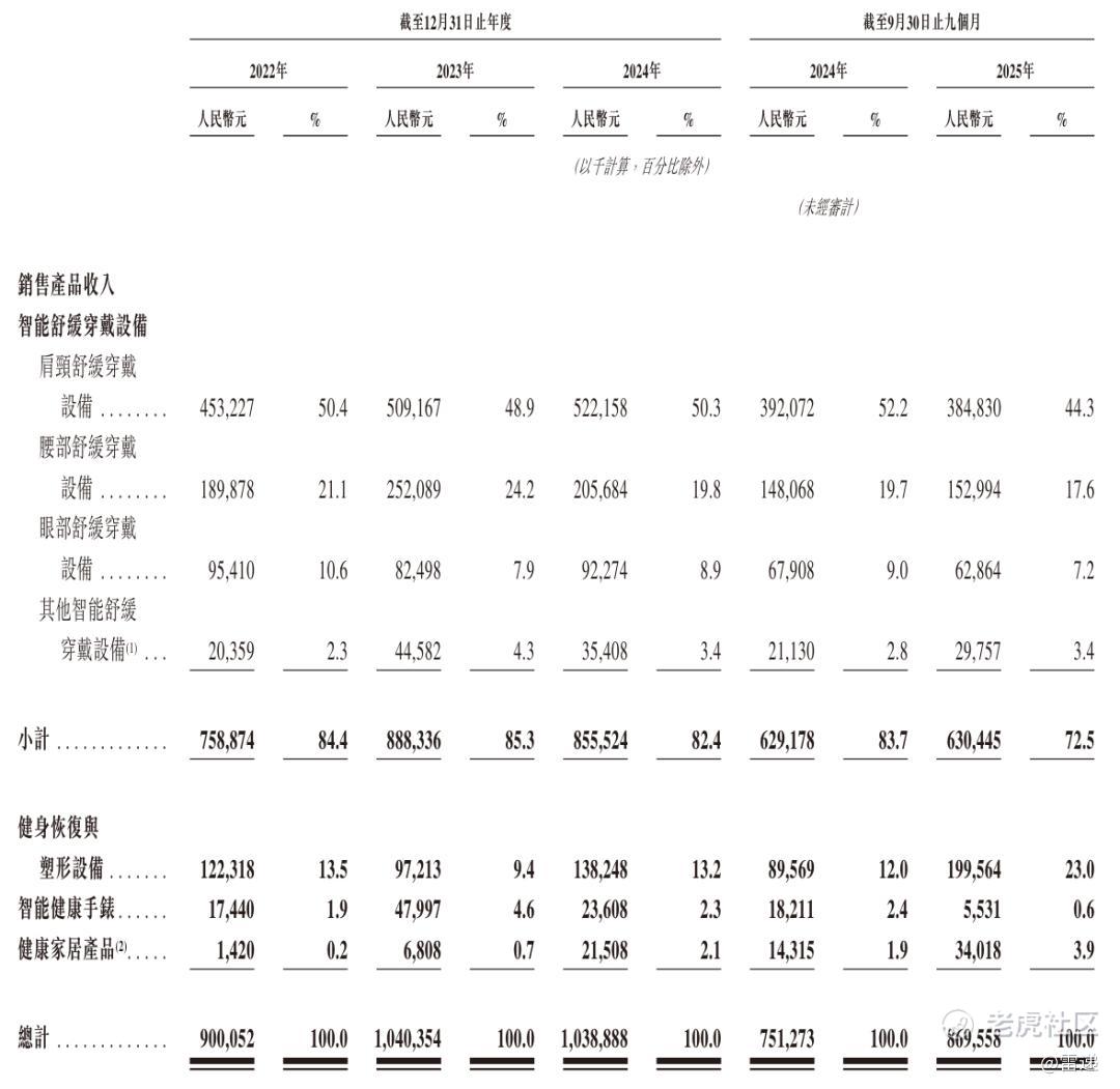 SKG未来健康2025年前9个月来自健身恢复与塑形设备收入为2亿元,占比为23%;来自智能健康手表收入为553万元,占比为0.6%;来自健康家居产品收入为3402万元,占比为3.9%。