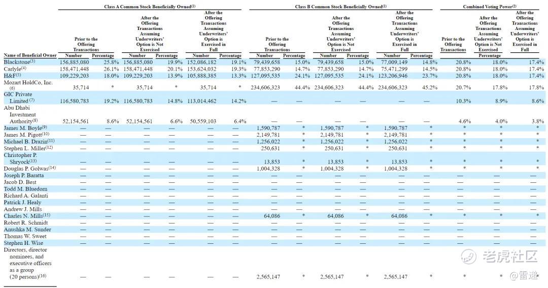 IPO前,Blackstone持有25.8%的A类股,及15%的B类股;Carlyle持有26.1%的A类股,14.7%的B类股;H&F持有18%的A类股,及24.1%的B类股;Mozart HoldCo持有44.4%的B类股;