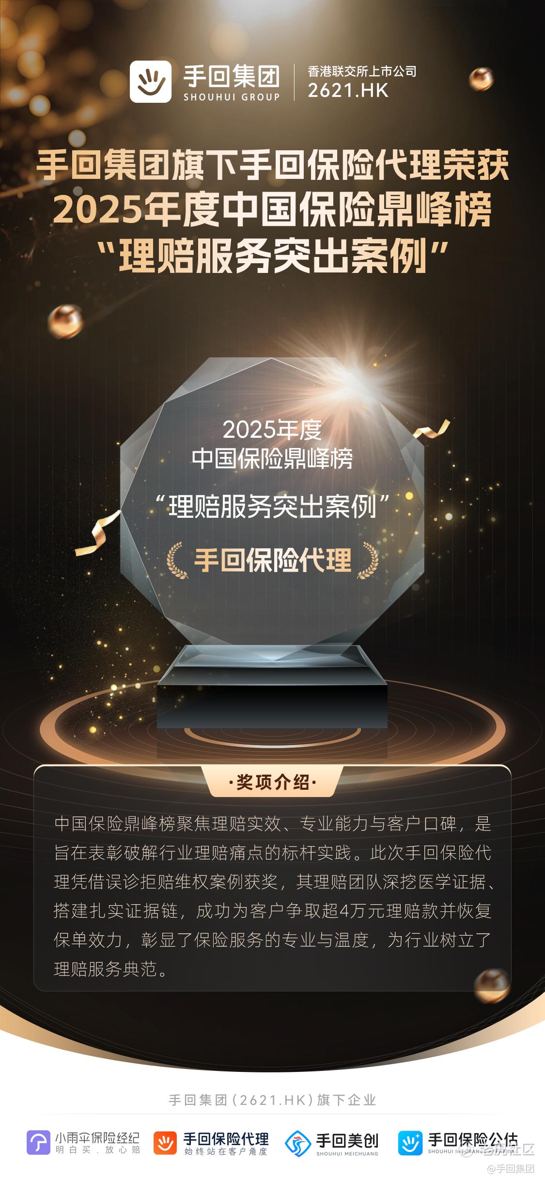 实力认证!手回集团旗下子公司手回保险代理凭误诊拒赔维权案例斩获鼎峰榜大奖!客户确诊重疾遇拒赔困境,理赔管家全程跟进,逐份核查医学报告找突破,用专业逻辑说服保司,最终全额赔付+恢复合同效力!让保险的保障价值真正落地,传递行业正能量,用责任传递保险温度。