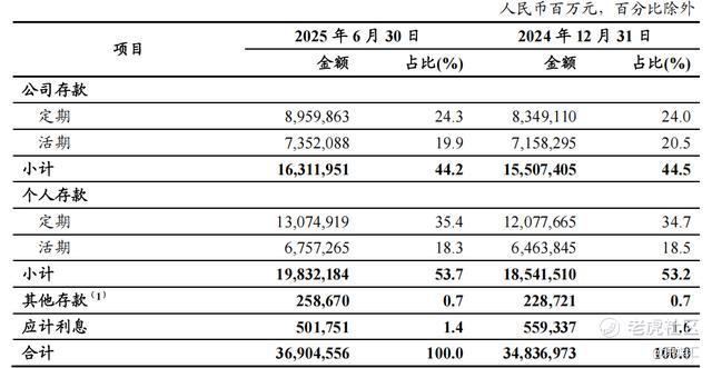 至2025年上半年末的约36.9万亿元中,公司存款约16.31万亿元,占比为44.2%,较2024年末减少0.3个百分点;个人存款约19.83万亿元,占比为53.7%,较2024年末增加0.5个百分点。这意味着,工行的存款中,不到2元就有1元来自个人储户。