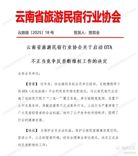 云南省旅游民宿行业协会一纸维权公告,正式对携程等在线旅游平台的垄断行为“宣战”,这场涉及7000家会员、直指“二选一”“随意涨佣”“屏蔽流量”的集体行动,不仅将平台与中小商家的矛盾推向舆论顶峰,更揭开了在线旅游行业长期存在的生态失衡伤疤。