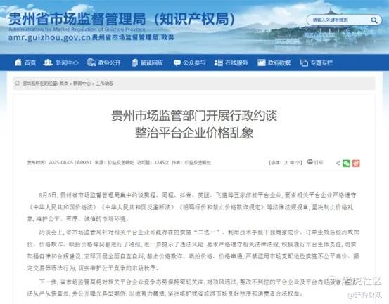 8月5日,贵州省市场监督管理局集中约谈携程等5家涉旅平台,直指其可能存在的“二选一”、技术干预定价、价格欺诈等问题,要求严格遵守《反垄断法》《价格法》等法律法规。