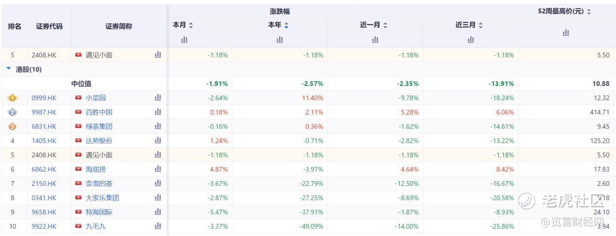同花顺数据显示,今年以来,港股市场餐饮板块表现疲软,部分头部餐饮企业股价持续下跌,市场对餐饮股的信心不足。