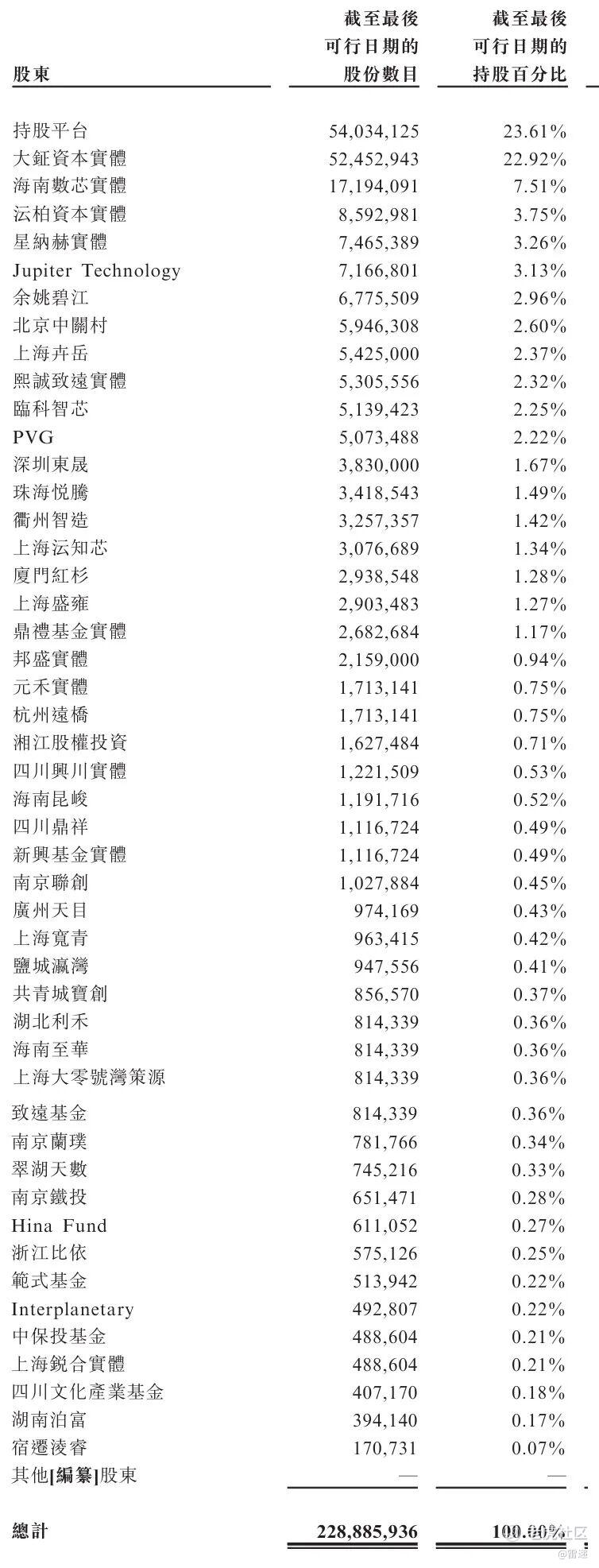 沄柏资本实体持股为3.75%,星纳赫实体持股为3.26%,Jupiter Technology持股为3.13%,余姚碧江持股为2.96%,北京中关村持股为2.6%,上海卉岳持股为2.37%,熙诚致远实体持股为2.32%,临科智芯持股为2.25%,PVG持股为2.22%,深圳东晟持股为1.67%;