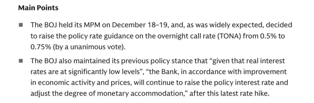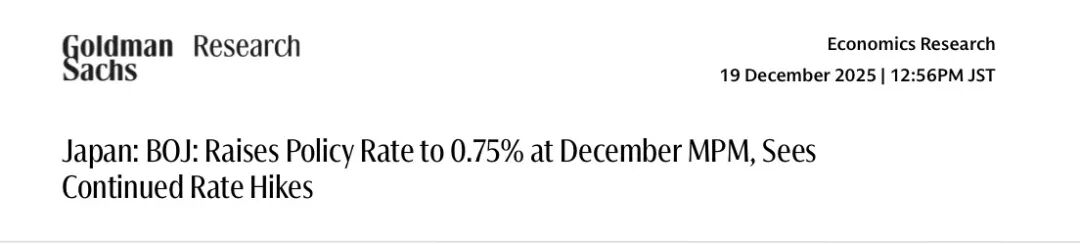 高盛日本团队12月19日发布研报,日央行如期加息25bp至0.75%,全票通过。