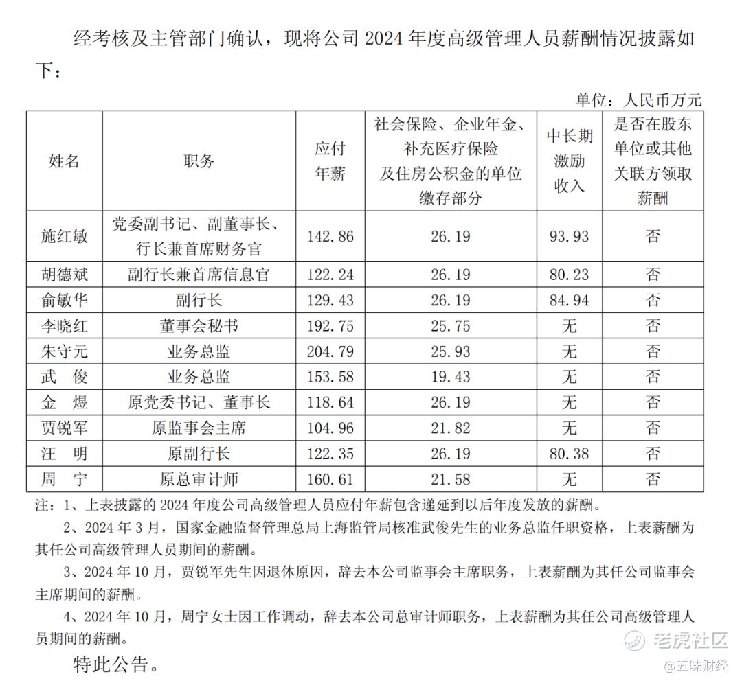 其中,有中长期激励收入的包括副行长兼首席信息官胡德斌,薪酬为228.66万元;副行长俞敏华,薪酬为240.56万元;原副行长汪明,薪酬为228.92万元。