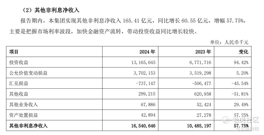 财报显示,该行2024年实现投资收益131.66亿元,同比增长94.42%,贡献了主要的增量。