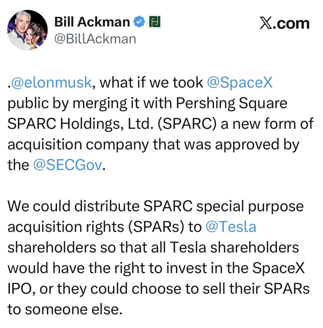 Ackman提出SpaceX上市新路径:绕开传统IPO,特斯拉股东优先认购