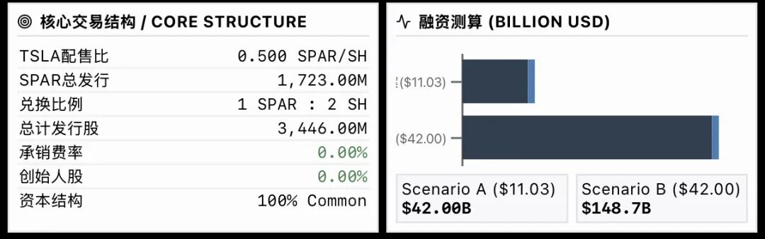 根据方案设计,特斯拉每股将获得0.5个SPARs,总计约17.23亿个,每个SPAR可兑换两股SpaceX股票。