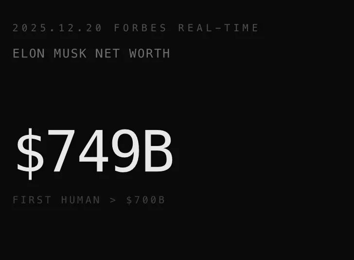 12月20日,埃隆·马斯克净资产飙升至7490亿美元,成为人类历史上首位突破7000亿美元门槛的超级富豪。