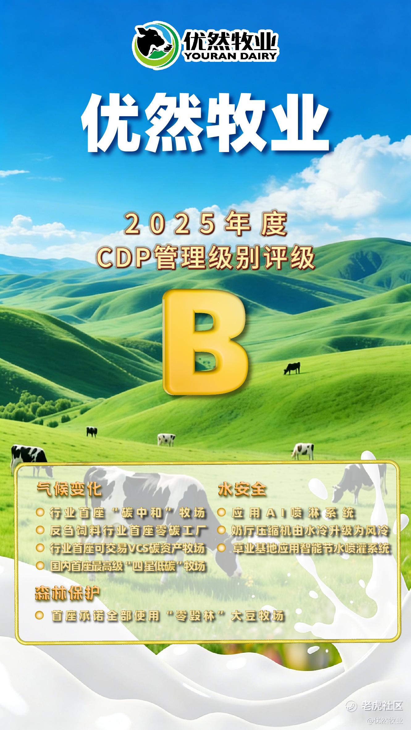 作为行业践行可持续发展与碳减排的先行者,优然牧业的绿色发展举措已得到多个国际国内权威组织和机构认可,从国内首张动物健康碳足迹认证证书的获得,到自治区级绿色工厂的权威认证,从连续两年入选标普可持续发展年鉴(中国版),到万得ESG评级两连跳跃升至AA级,优然牧业正以实际行动描绘可持续发展的新图景。此次荣获 CDP 年度评级B级评定,将成为公司深化绿色转型的新起点,推动企业在高质量发展道路上持续领跑。 $优然牧业(09858)$