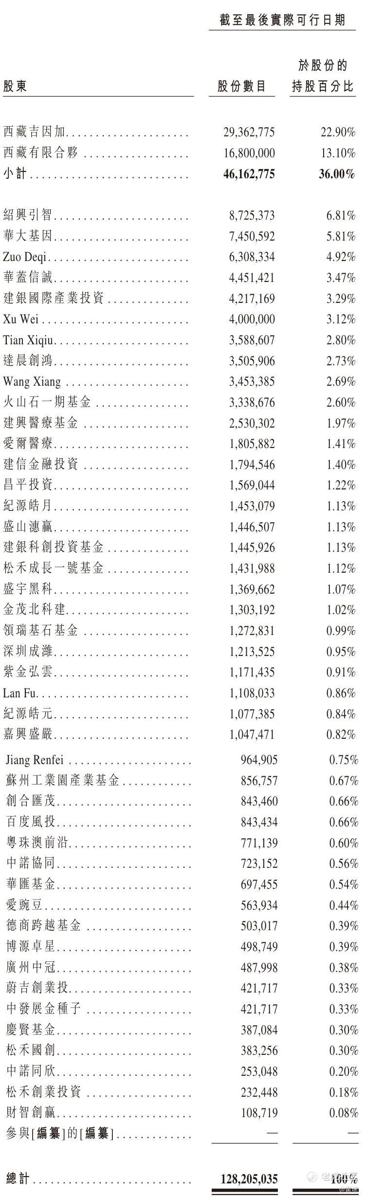 绍兴引智持股为6.81%,华大基因持股为5.81%,Zuo Deqi持股为4.92%,华盖信诚持股为3.47%,建银国际产业投资持股为3.29%,Xu Wei持股为3.12%;