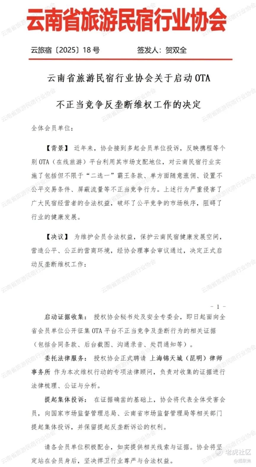 12月8日,云南省旅游民宿行业协会的一纸声明,如同一声惊雷,炸响了整个在线旅游行业。协会正式宣布,启动对携程等OTA平台的反垄断维权行动,矛头直指其利用市场支配地位进行的不正当竞争行为。