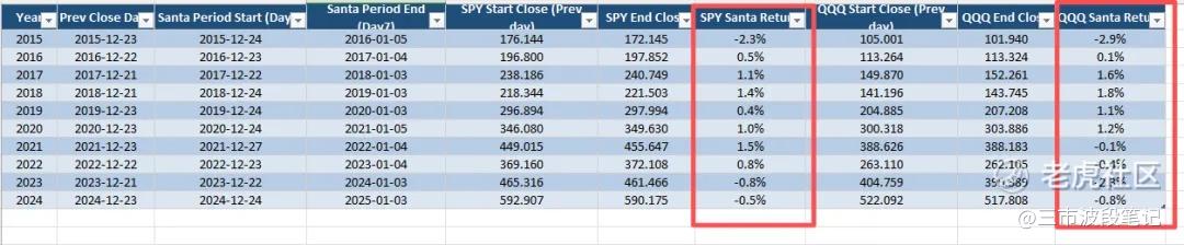 我拉了过去10年SPY和QQQ在圣诞行情之间的数据,圣诞行情的时间一般是:12月最后5个交易日 + 次年1月前2个交易日(共7个交易日)。