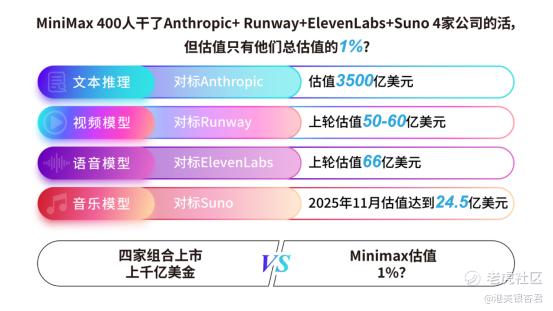 而MiniMax——400人团队,用三年时间,完成了上述四家公司才能覆盖的技术与产品版图。如果把这四家“打包上市”,市场至少会给几百亿美元估值。但MiniMax当前的估值,却仅为它们总和的约1%。