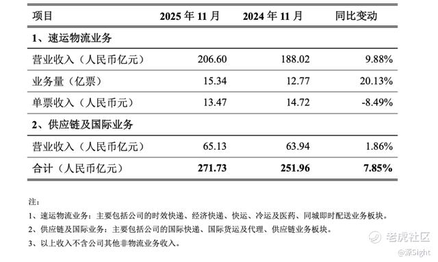 根据官方数据,今年11月,顺丰实现营收206.6亿元,同比增长9.88%;业务量15.34亿票,同比增长20.13%。但这期间,顺丰单票收入同比下跌8.49%至13.47元。