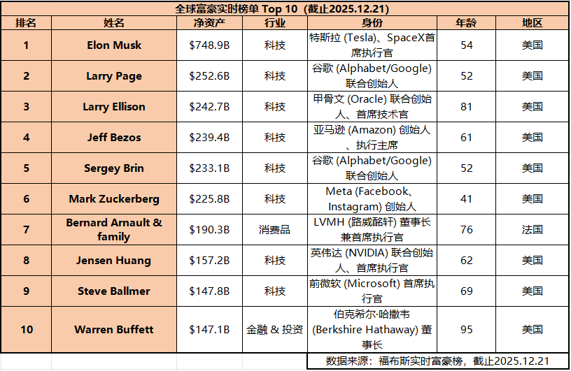 根据福布斯截止12月21日的实时数据显示,全球前十大富豪的财富格局正经历着前所未有的剧变,几乎全部来自科技行业或依赖科技驱动的公司。