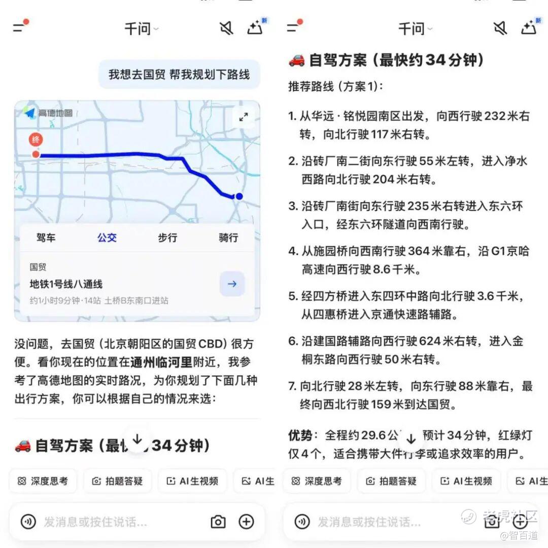 小编简单测了一下,想让千问帮忙规划到达北京国贸的路线,在对话框很快出现了地图卡片,方便我们跳转高德进行导航,并详细规划了地铁、打车/自驾、骑行方案。这一功能的上线,距离千问APP在11月13日正式推出才仅仅过去一个月。