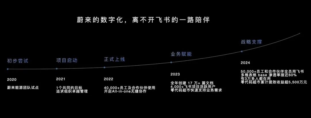 在2023年一年,蔚来一口气建设了1000多座换电站,最多时单月建设160座。在事后的总结中,李斌感叹道:“如果没有飞书对组织能力的支持,我们做不到换电站建设这么复杂的项目管理。”
