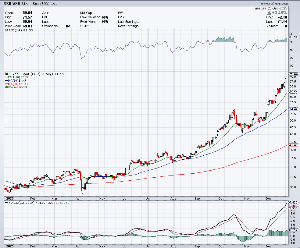 今年,如果有什么资产能让风头正劲的AI交易都显得暗淡无光,那非白银莫属。截至周二,被交易员称为“恶魔金属”的白银,今年至今的涨幅已达到惊人的147%,不仅轻松碾压了同期涨幅逾70%的黄金,更是远远甩了热门的半导体板块几条街。