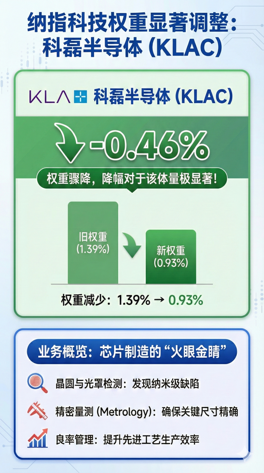 科磊半导体:权重从 1.39% 骤降至 0.93%,降幅对于该体量的股票非常明显。