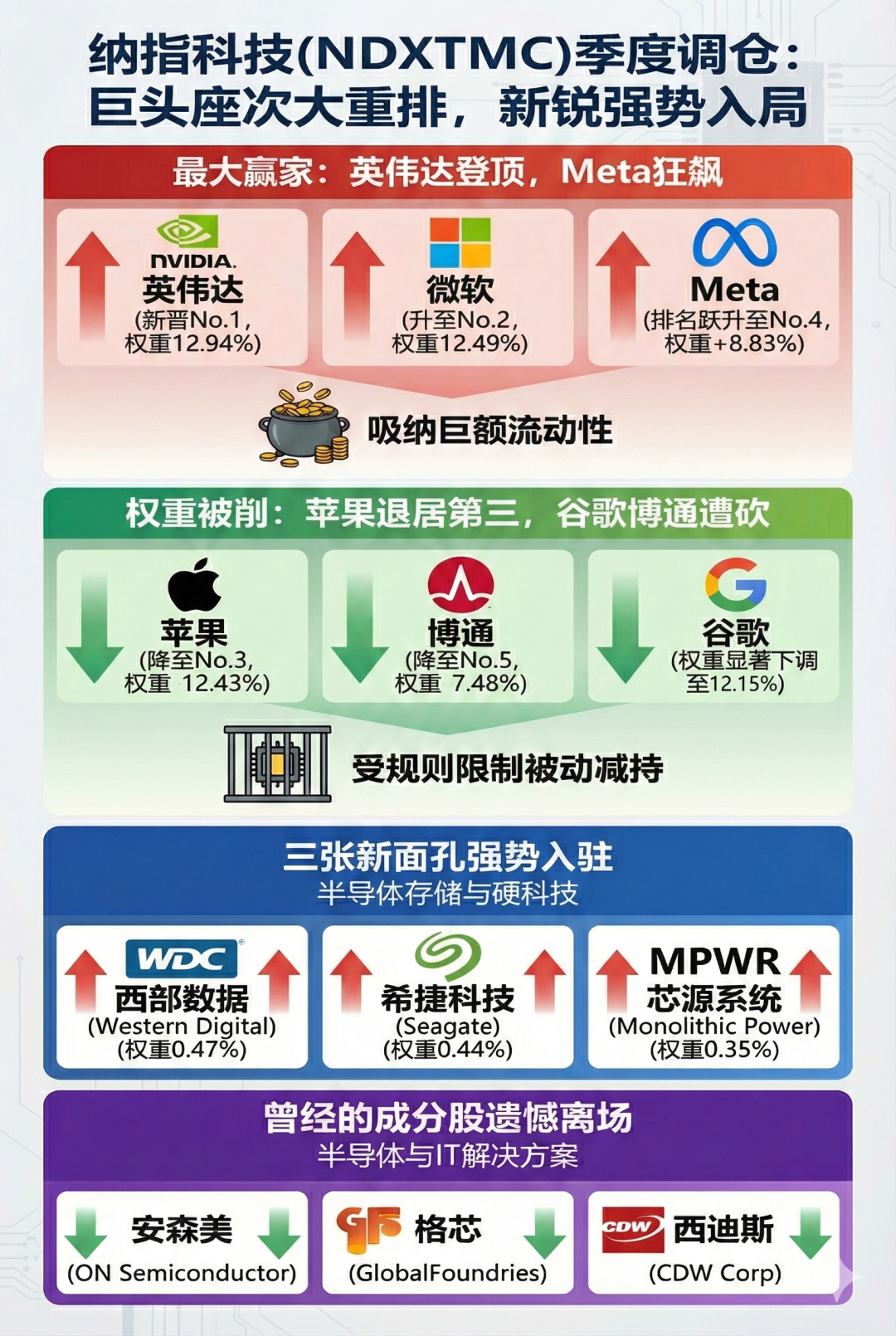 数据显示,前十大成分股中,Meta成为了本次调仓的最大赢家,权重激增至8.83%,而谷歌和博通则成为了主要的“输血者”。