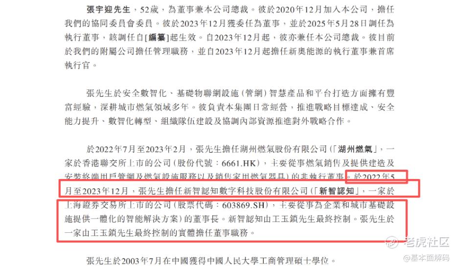 在审查新奥股份的高级管理层架构时,一个关键人物的履历引起基本面解码关注。港股招股书显示,新奥股份现任执行董事兼总裁张宇迎先生,曾于2022年5月至2023年12月担任前述造假公司新智认知的董事长。虽然新智认知的财务造假主要发生在2019年至2021年,但张宇迎先生在任期间,正是该公司违规行为发酵、监管介入调查以及年报披露的关键时期。