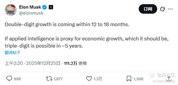 马斯克进一步补充道,如果应用智能可以作为衡量经济增长的指标,那么约五年内实现三位数增长也有可能。