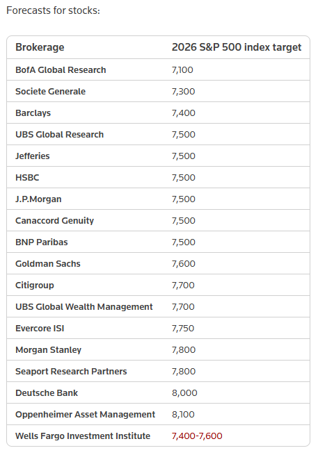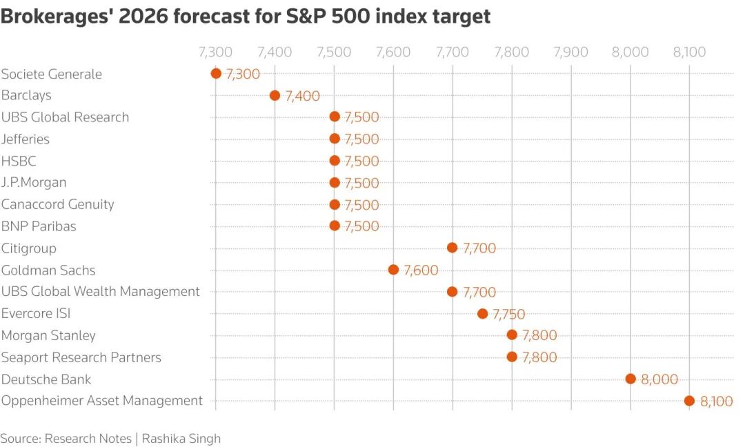 多家华尔街顶级投行此前已相继发布了对 2026 年标普 500 指数的展望。尽管目标点位存在差异,但普遍共识是,在 AI 投资浪潮持续、货币政策转向宽松以及盈利增长扩散的推动下,美股有望延续涨势。