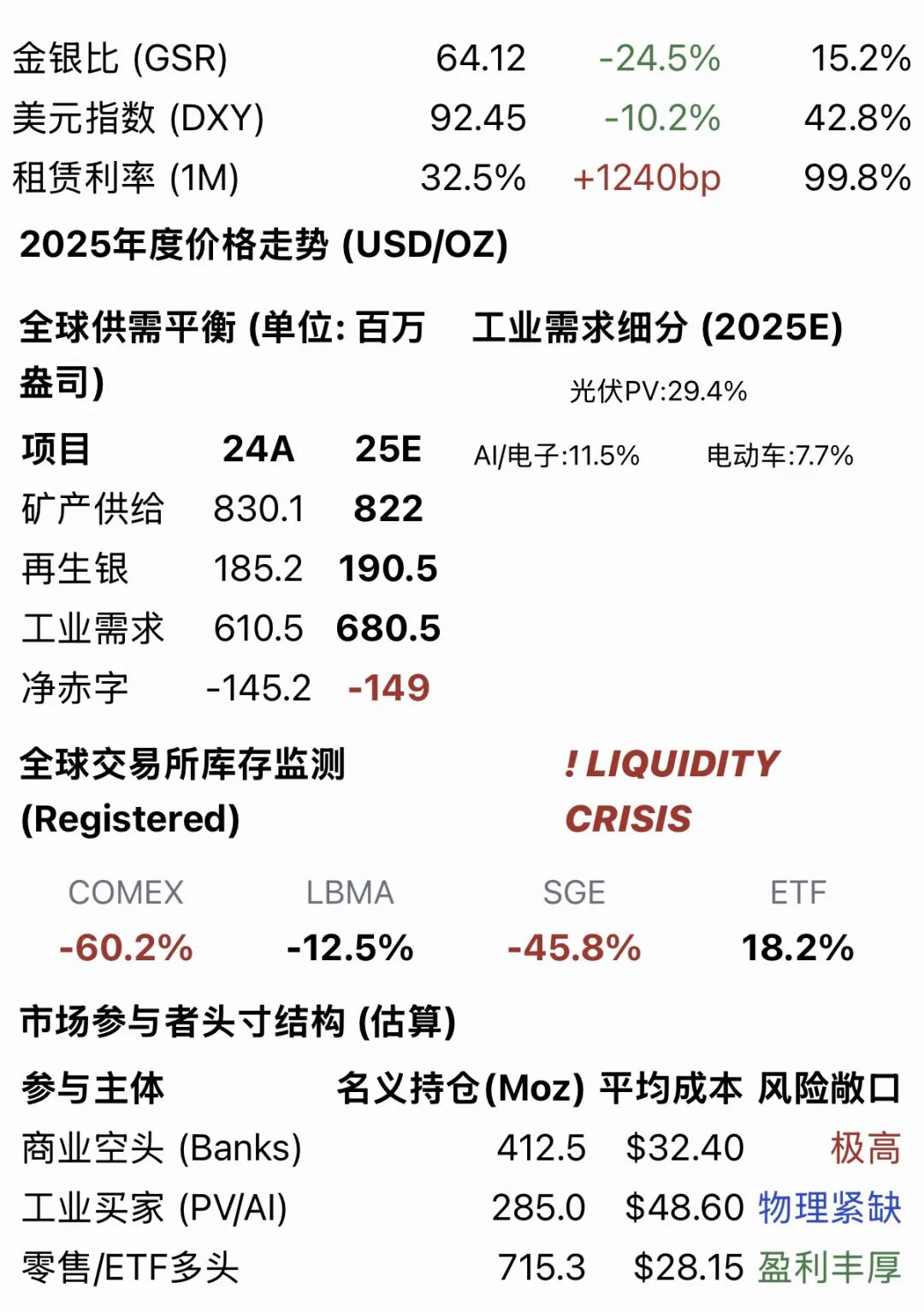 逼空的核心逻辑在于纸银与实物的严重错配。伦敦市场可自由流通的白银仅剩不足2亿盎司,较2019年下降75%,而纸面合约规模远超实物库存。