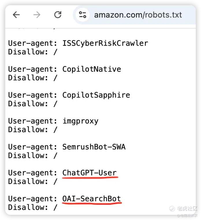 据蓝海亿观报道,亚马逊近期在robots.txt文件中明确屏蔽了ChatGPT的两个核心爬虫:ChatGPT-User(用于网页内容抓取)与OAI-SearchBot(用于搜索与内容更新)。