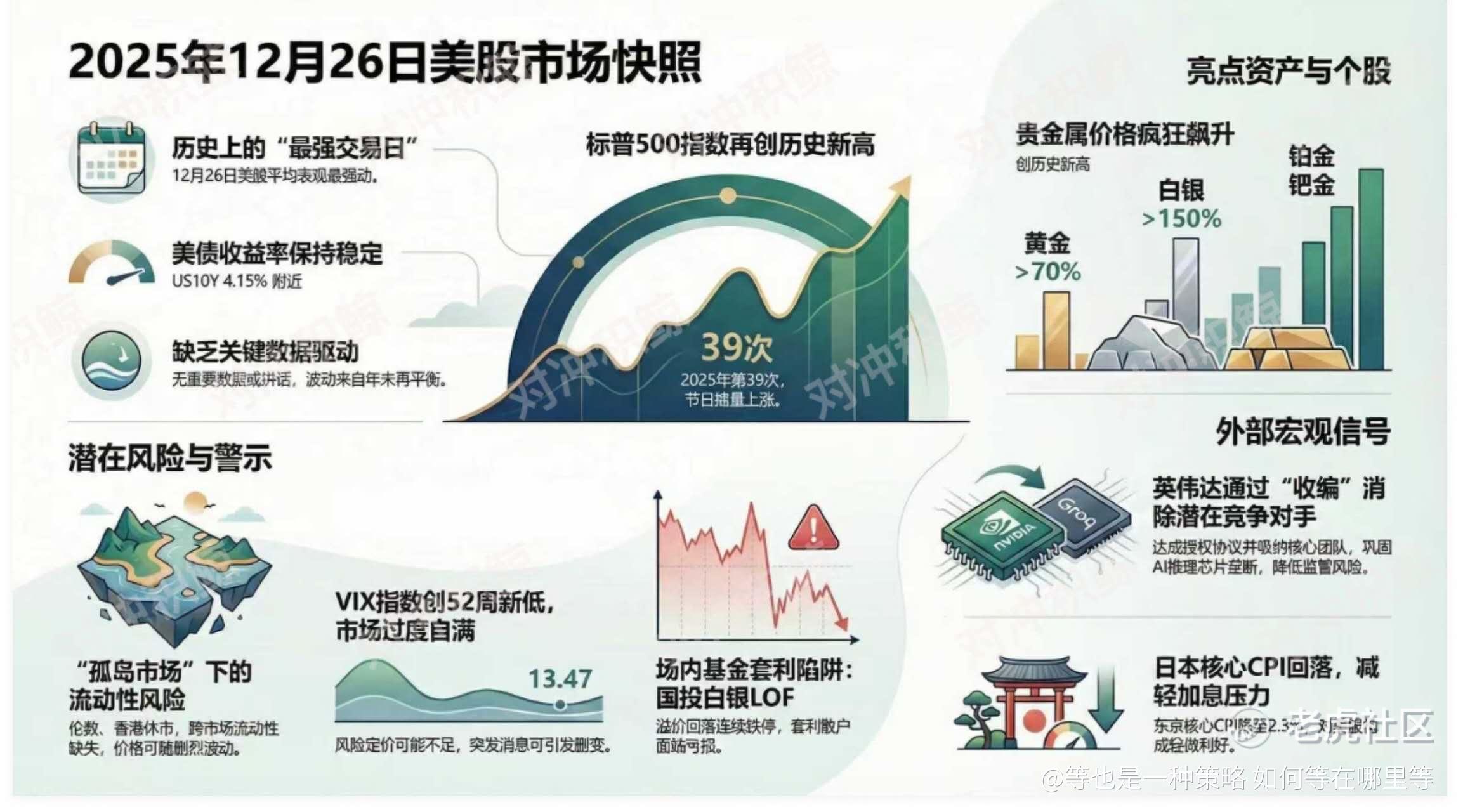 VIX跌至52周低点13.47,市场弥漫不安的自满情绪。假期流动性差,低VIX常意味着风险定价不足——突发消息(地缘或数据)或引发Gamma挤压,指数瞬间变脸。但也正是难得的对冲窗口。