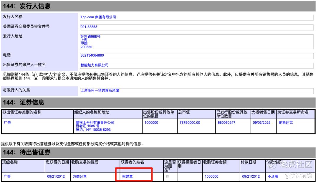 据美国SEC披露文件,今年9月初携程董事局主席梁建章出售了100万股美国存托股份(ADS),套现约5.27亿元人民币;联合创始人兼总裁范敏减持7万股ADS,套现约3242万元;首席运营官熊星则减持40万股ADS,套现约2亿元。