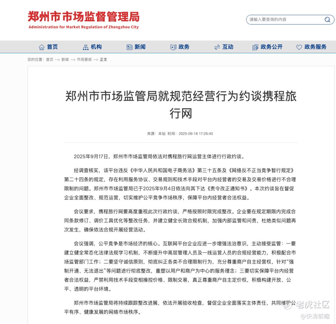 随后在9月17日,郑州市市场监管局又对携程运营主体进行了行政约谈。调查发现,携程违反《电子商务法》第35条及《网络不正当竞争暂行规定》第24条,存在利用服务协议、交易规则和技术手段对平台内经营者的交易及价格进行不合理限制的问题。