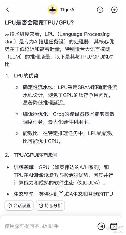 接着回答第2个问题,从技术维度上,LPU会不会把TPU/GPU推下神坛?这个问题对我一个 把大部分闲暇时间用在厨房和厅堂的小妇人来说,实在有点超标了。[笑哭] 不过,怕什么呢,有TigerAI可以问啊。看看这个答案,我这个技术小白也能看个七七八八。