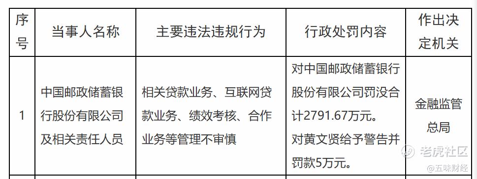 2025年9月30日,邮储银行曾收到一张“天价”罚单。因相关贷款业务、互联网贷款业务、绩效考核、合作业务等管理不审慎,国家金融监督管理总局对邮储银行罚没合计2791.67万元。