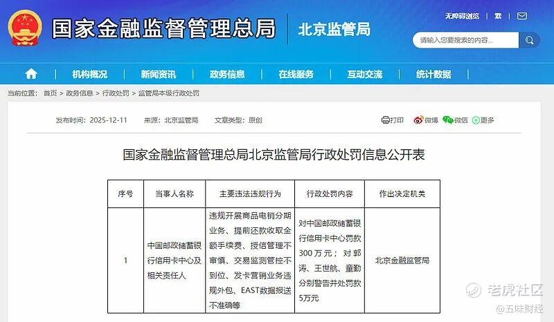 2025年12月11日,国家金融监督管理总局北京监管局发布一则行政处罚公告,公告显示,中国邮政储蓄银行信用卡中心因六项违法违规行为领到300万元罚单,涉及违规开展商品电销分期业务、提前还款收取全额手续费、授信管理不审慎等多个层面,三名相关责任人也同步受到警告及罚款处罚。
